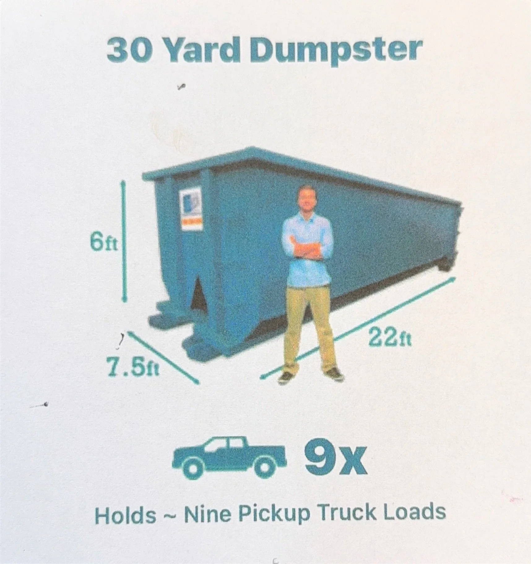 30 Yard: holds ~9 pickup truck loads with an allowed weight of up to 3 tons