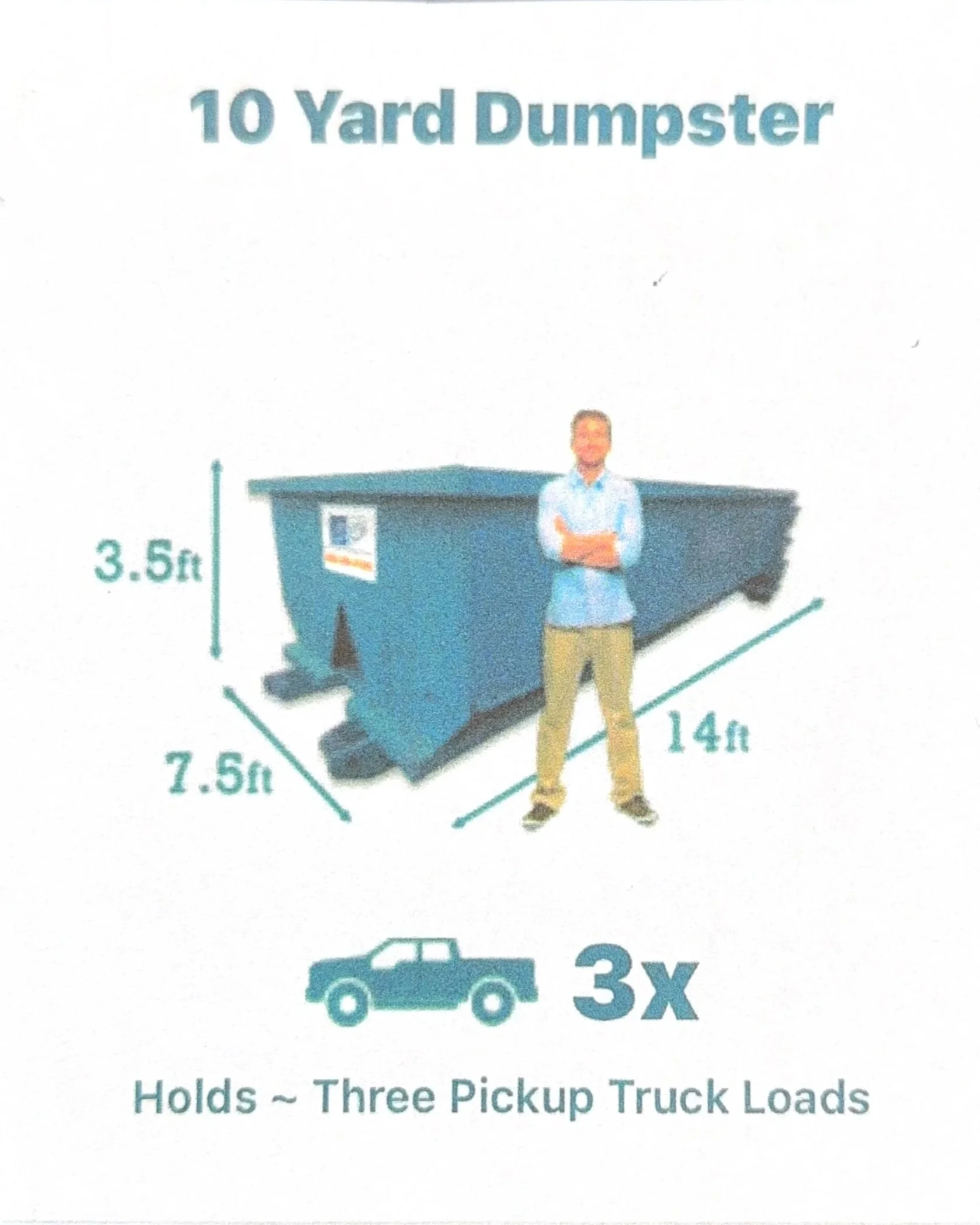 10 Yard: holds ~3 pickup truck loads with an allowed weight of up to 1 ton