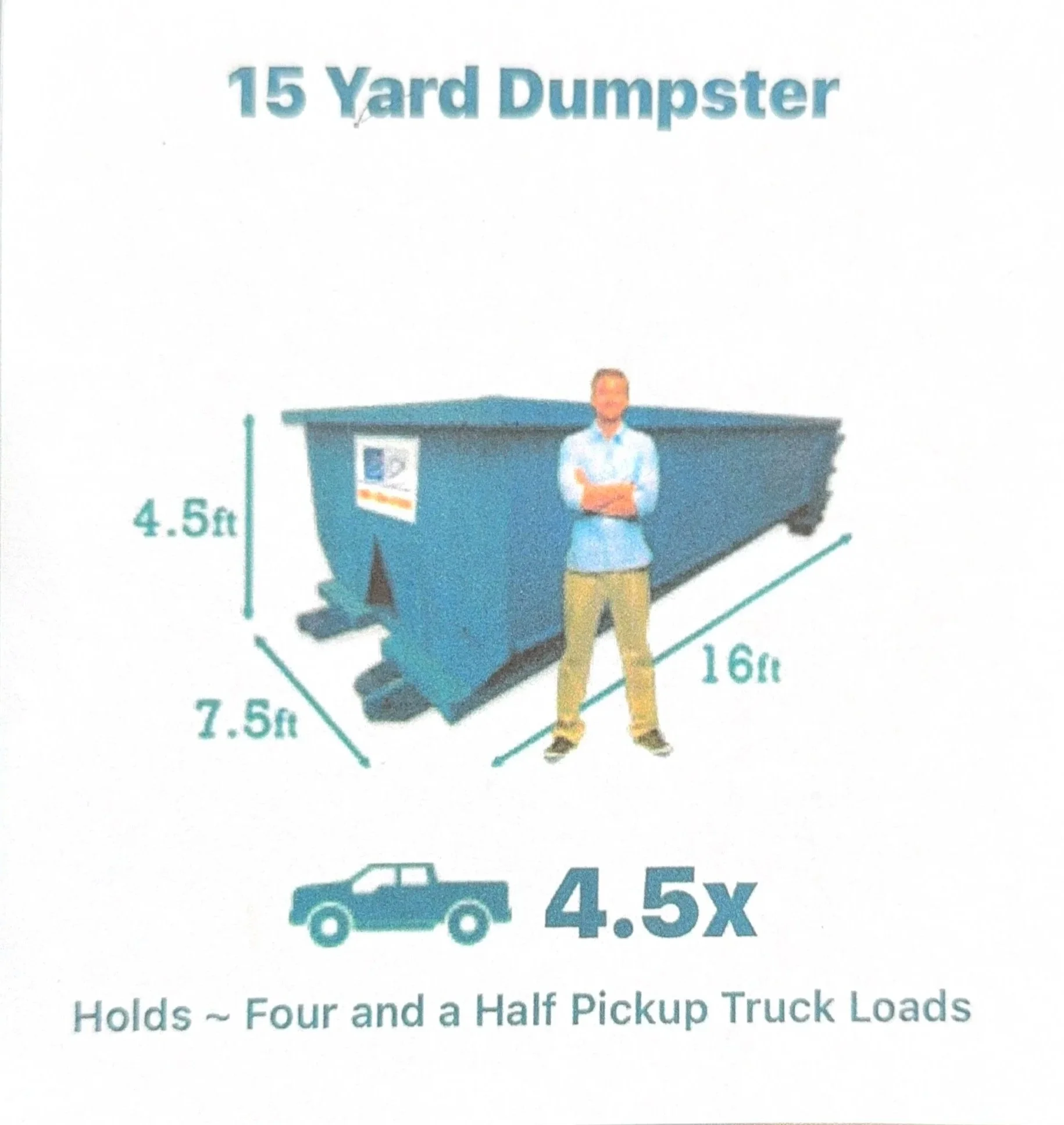 15 Yard: holds ~4.5 pickup truck loads with an allowed weight of up to 1.5 tons
