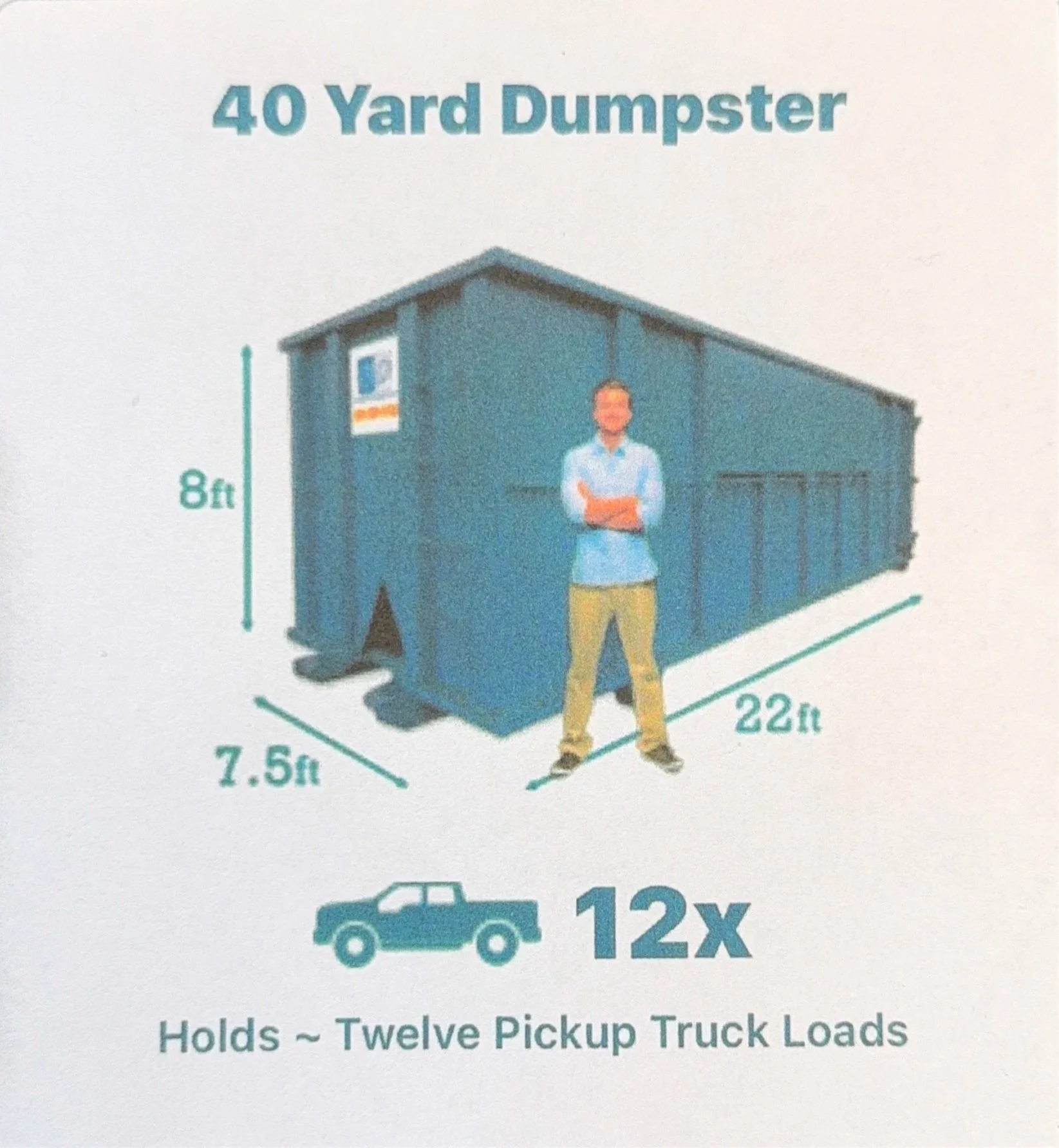 40 Yard: holds ~12 pickup truck loads with an allowed weight of up to 4 tons. This size is used for demolitions and large scale cleanup projects!
