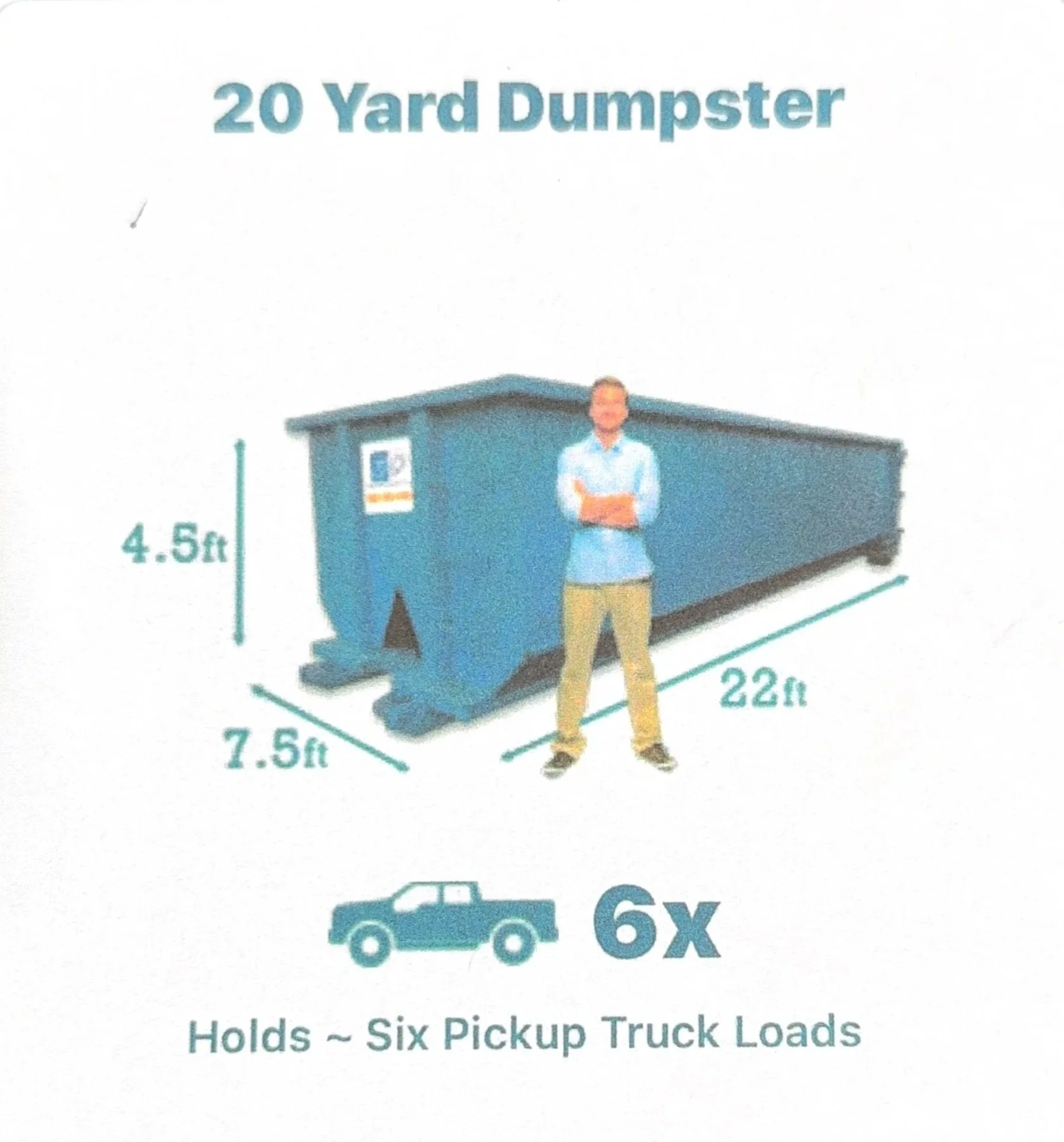 20 Yard: holds ~6 pickup truck loads with an allowed weight of up to 2 tons